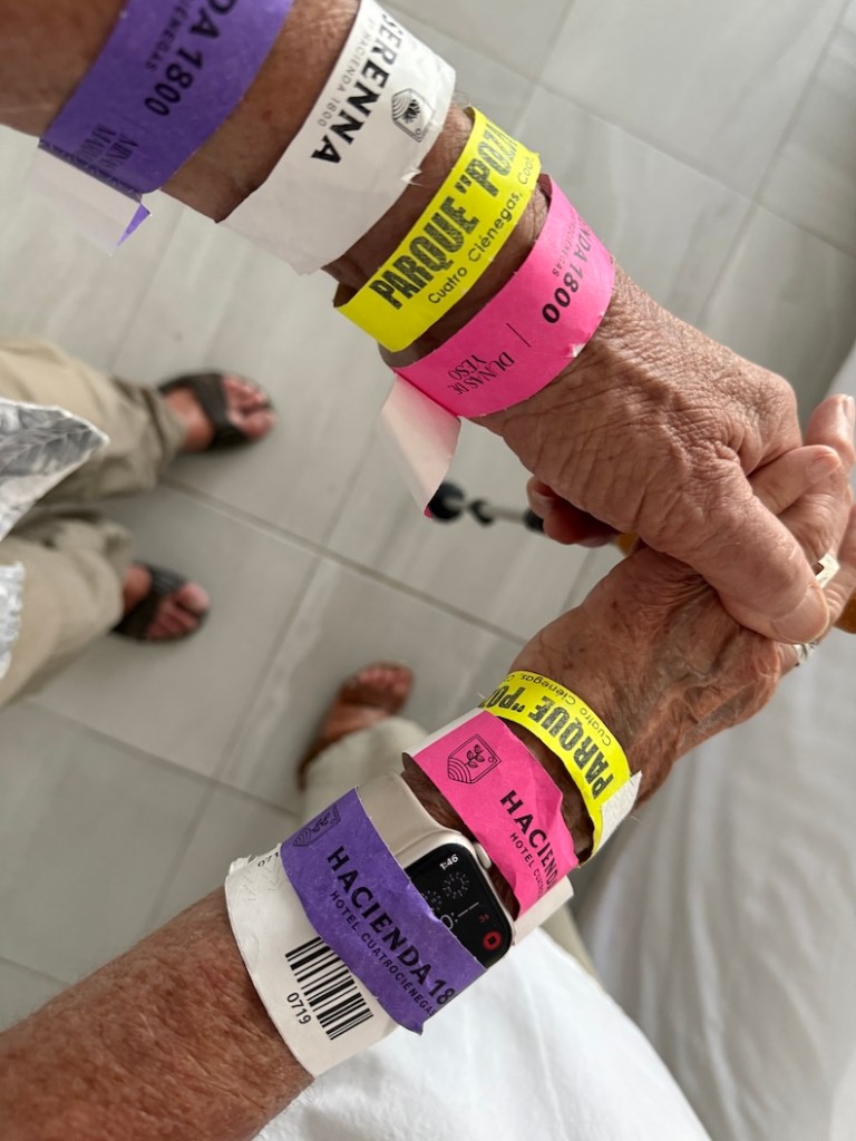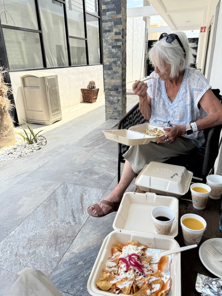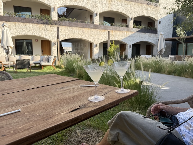 We return hungry from the tour, and settle into a quiet courtyard with cold drinks as we recount the day. From there we migrate to platters of delicious evening fare, and some good Mexican wine.