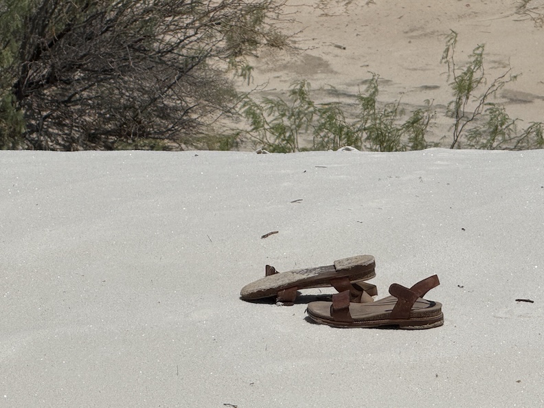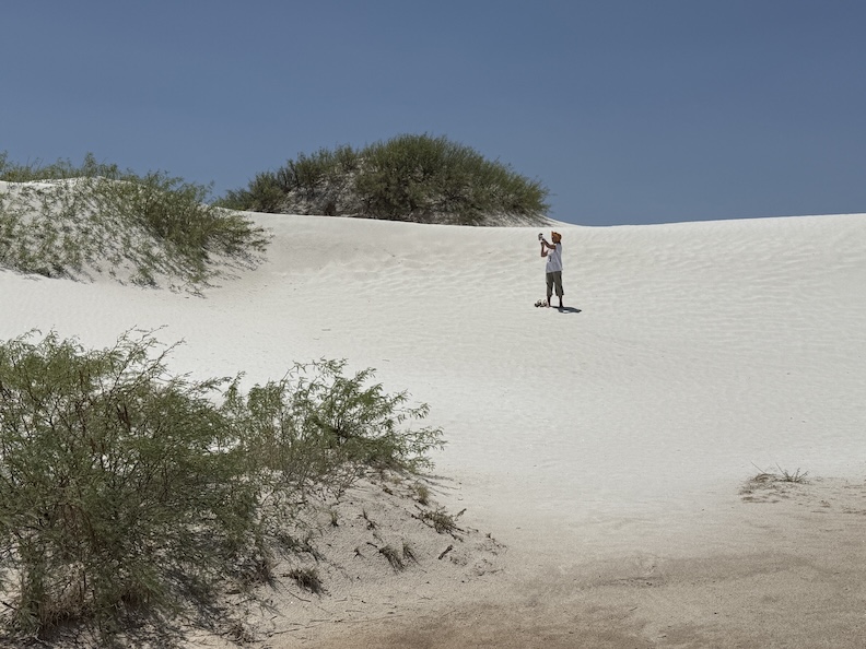 The dunes are next, and shoes are optional. It’s a sublime experience to feel the finest of warm gypsum sands between your toes while climbing dunes that have collected here during countless passing winds as warm air lifts over the mountains and drops its sandy load at this special spot. In the distance the process continues, as the warming afternoon desert breeze rises over the tallest mountains and the moisture condenses into clouds to feed rainfall back into the marvelous cycle that nourishes this rare desert oasis.