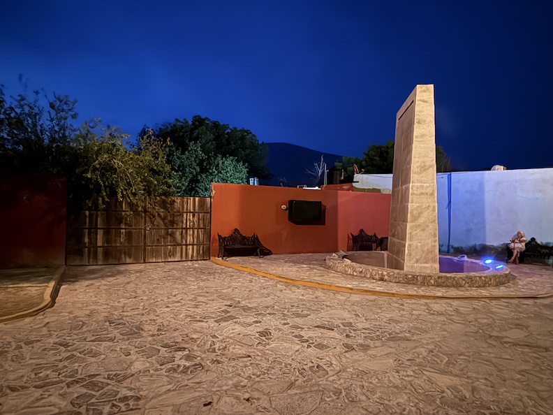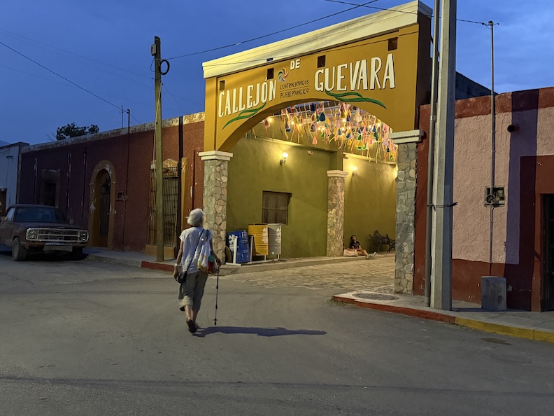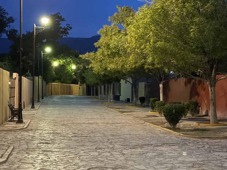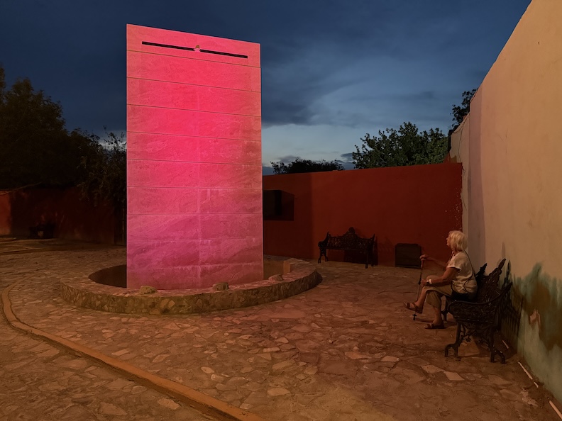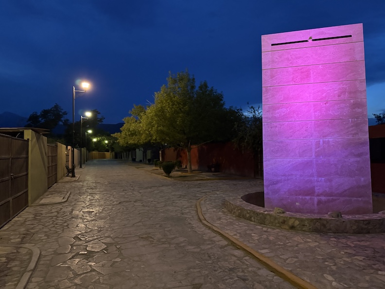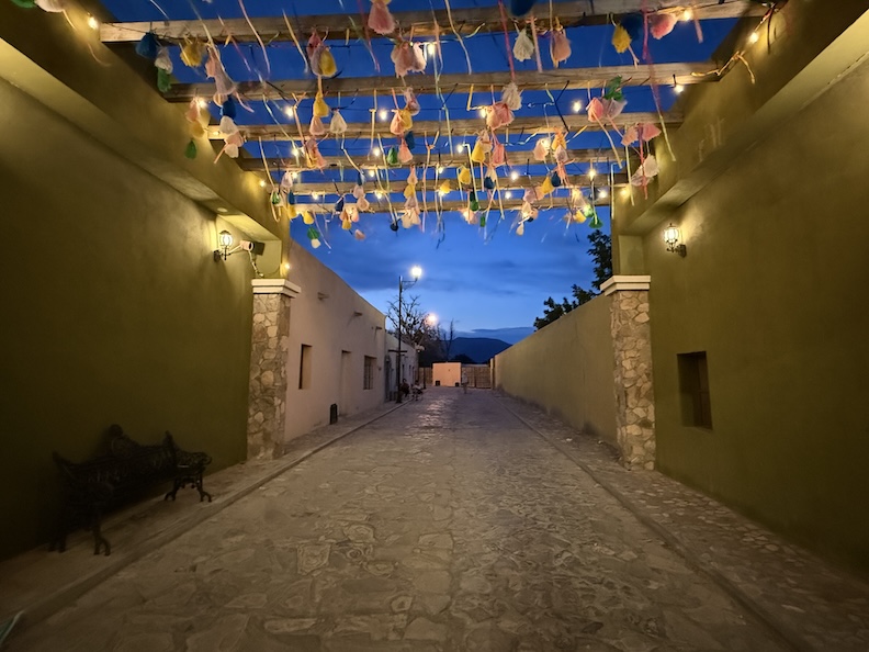 Magnificent evening colors paint the sky along with the artful lighting of the church, and it beckons us to explore more of this fine little city. We follow the lights of an interesting street to where we encounter the Callejon de Guevara. We have no idea what lies in store, but it’s a pleasant surprise to find such an exuberantly lighted entryway to what appears to be a classy residential area – a place for those with the means and inclination to sequester themselves here in the quiet desert.