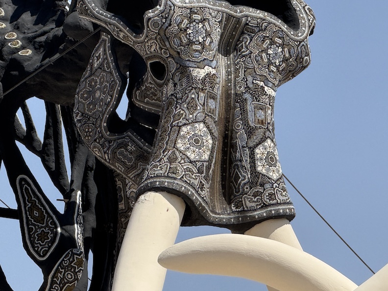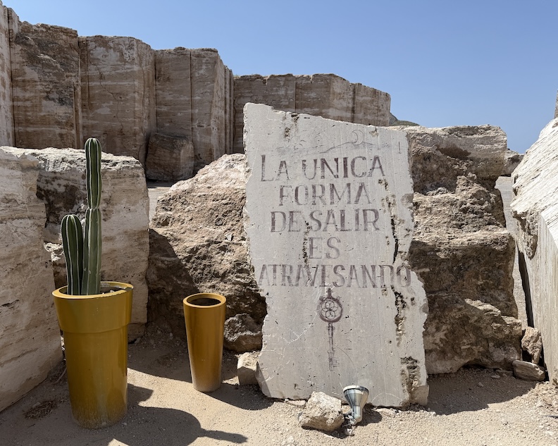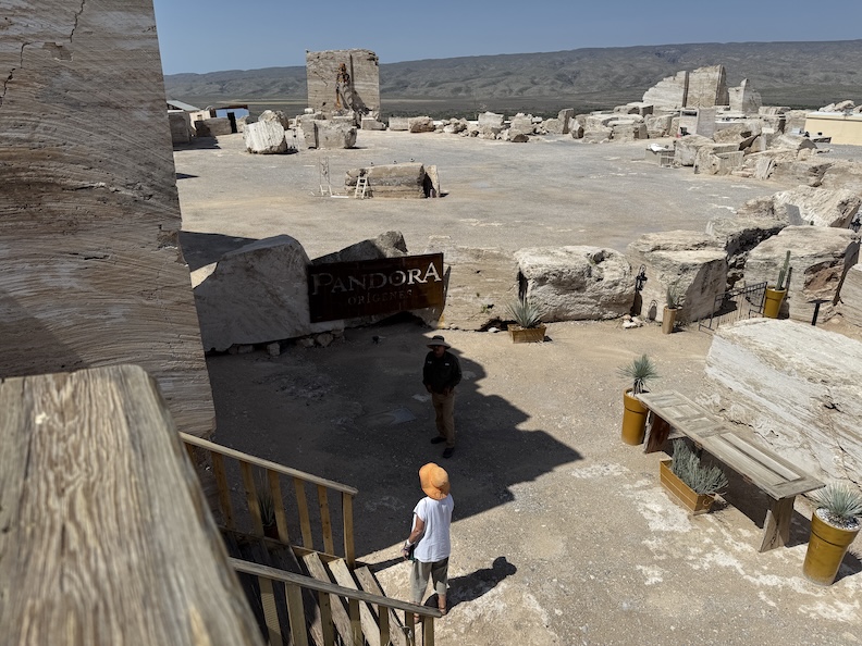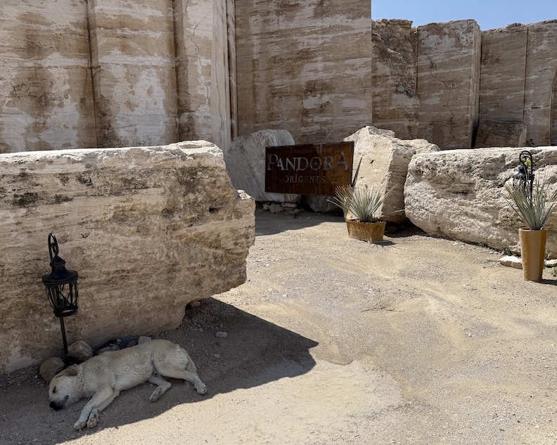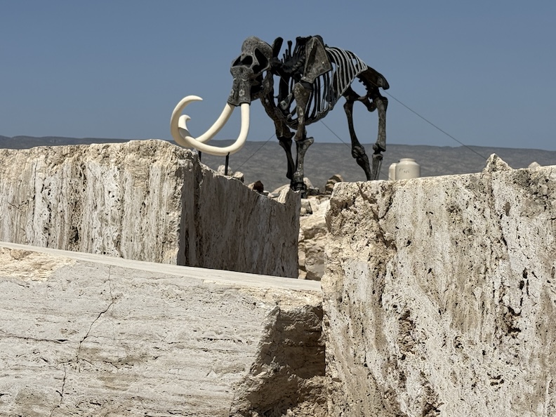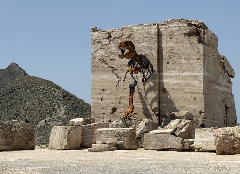 The tour begins with the artful reuse of an old quarry site that was carved off the end of a mountain that overlooks the vast desert landscape. It has since become a sculpture garden containing some large and fantastical creatures. The whole site actually looks dinosaurial, as if these monsters really could have been found within the stone. And a dog is sleeping unperturbed in the shade of a huge leftover marble block.