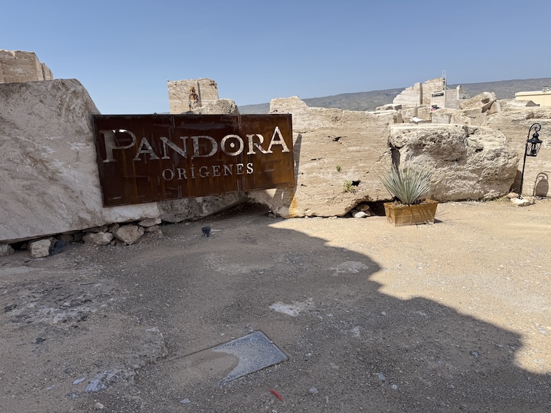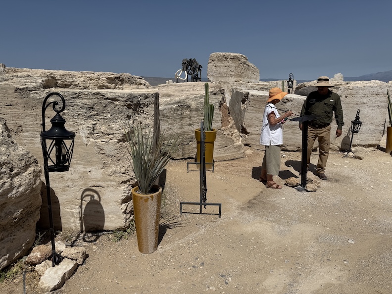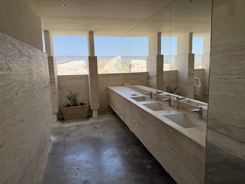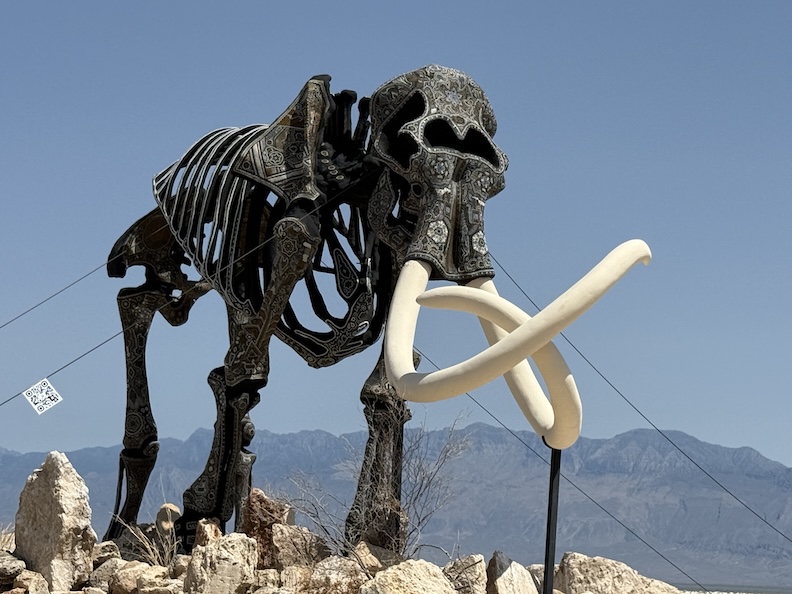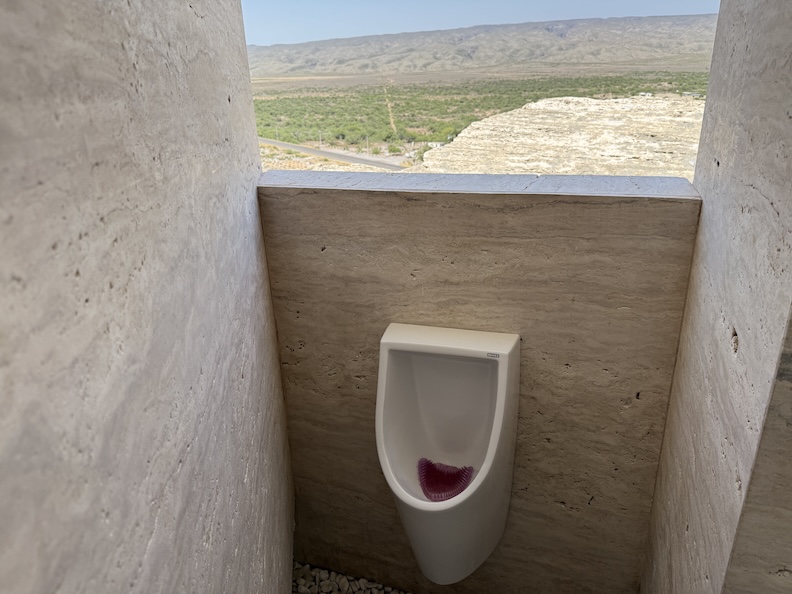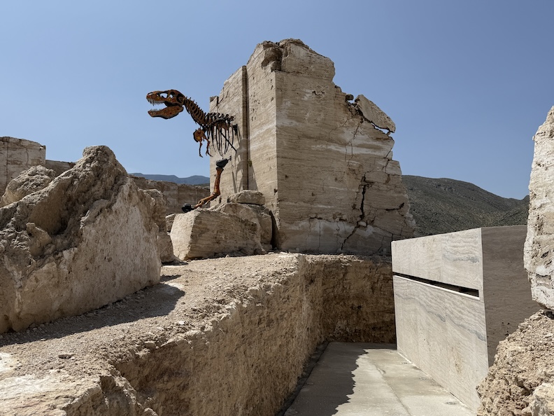 I search out the restroom facilities, which are down a ramp beside a giant skeletal T-Rex that’s roaring out of a leftover stone face. And the relief station is worth a visit of its own. Especially for the fine view from the urinals overlooking the desert, where you can watch the occasional car or truck passing on the highway below. It’s more creative than most restrooms, and much less boring than staring at a blank tile wall.