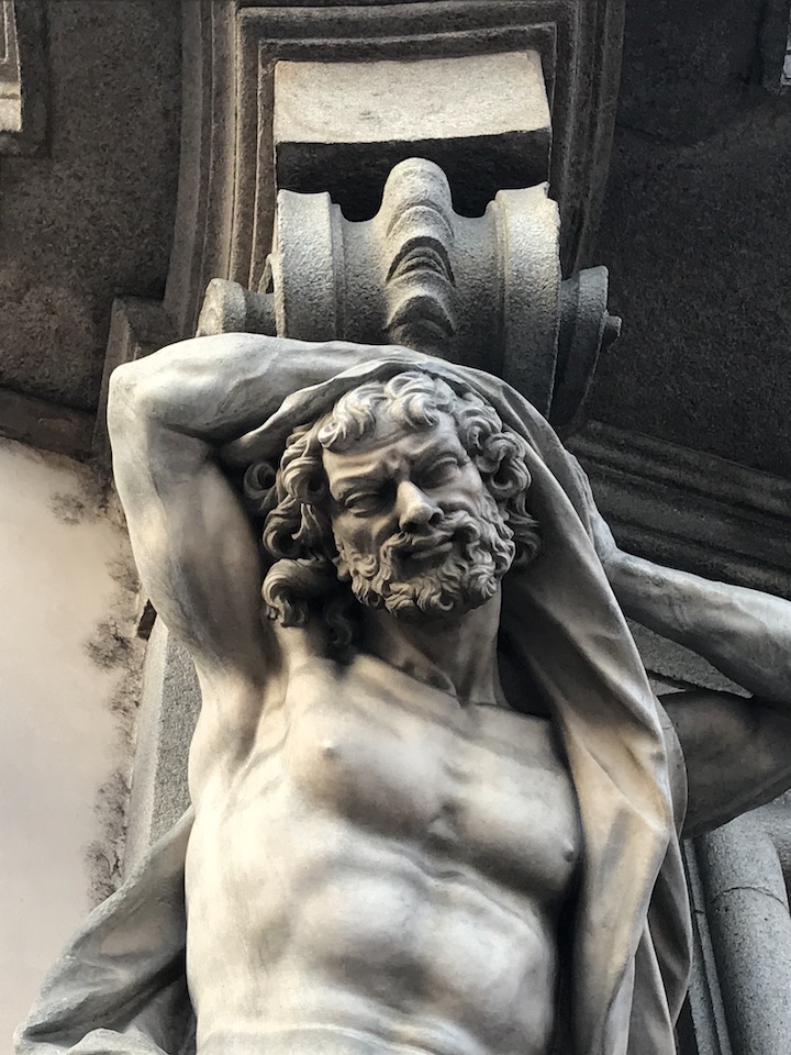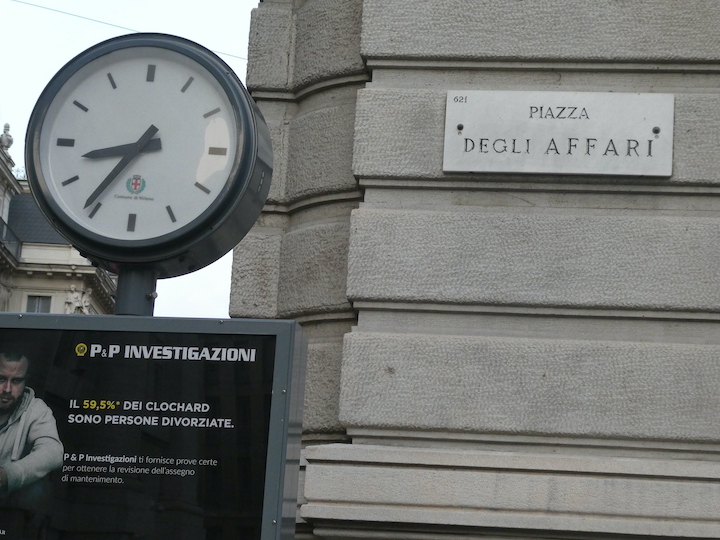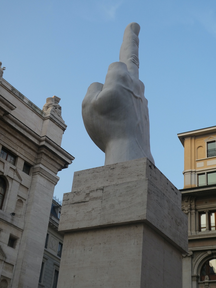 Milan is home to a vast array of sculptures that span the centuries, the conflicts, and the conquerors that have composed its long history. But “Il Dito” (’the Finger,’ 2010) is surely one of the more provocative pieces to be found during our Milanese wanderings. At first glance, and considering its location on the Piazza degli Affari directly in front of the Borsa Italiana (Italian Stock Exchange), it seems to be a protest against the Italian monetary elite. But a closer look reveals that the thumb and three fingers are severed, leaving only that prominent middle finger. The piece is entitled L.O.V.E. (Libertà, Odio, Vendetta, Eternità), and some have also seen it as a crippled form of the full-handed Fascist salute that served the country so ruinously under Mussolini during WWII. And since the artist, Maurizio Cattelan, has never given an explanation for the meaning of the work, we are free to derive our own impressions from this massive piece of fine Carrara marble.