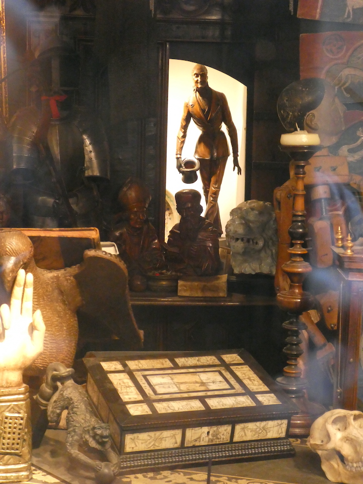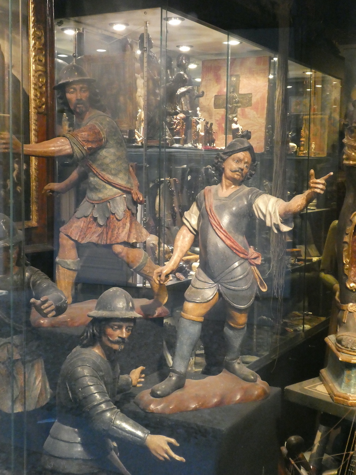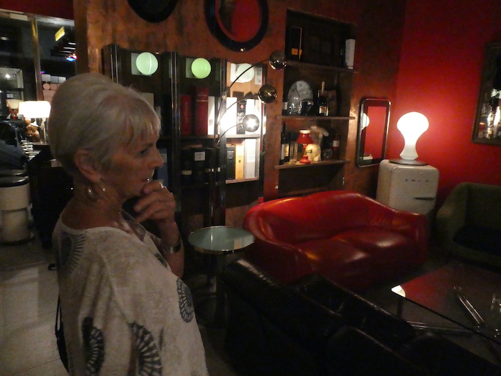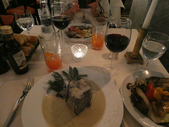 Later that evening we’re poking around some other back streets hoping to find a special place for dinner. The streets and the buildings are dark, and it looks like we’ve taken a very wrong turn. Then Carolyn sees a dim flicker down a side street, and we hope it’s a neighborhood bar or something similar. The street is so dark that we feel our way carefully over the cobbles – and we find a hidden treasure. Inside the door we pass an ornate bar and go deeper into the building until we’re in a secret ristorante that looks like someone’s very large living room, with subdued lighting, and fine tables with overstuffed chairs, and art and heirlooms along the walls.