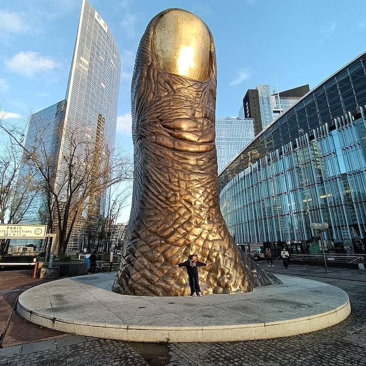 For a different artistic celebration of the marvelous human hand, that some have interpreted as a positive ‘Thumbs Up,’ check out “Le Pouce, (1965)” César Baldacini’s 40-foot tall “Thumb,” in the La Dèfense district of Paris. We’ve also seen a large ‘Thumb’ replica in a traffic circle in Marseilles, and a 6-foot version on the grounds of the Sammlung Ludwig Museum in Koblenz, Germany.