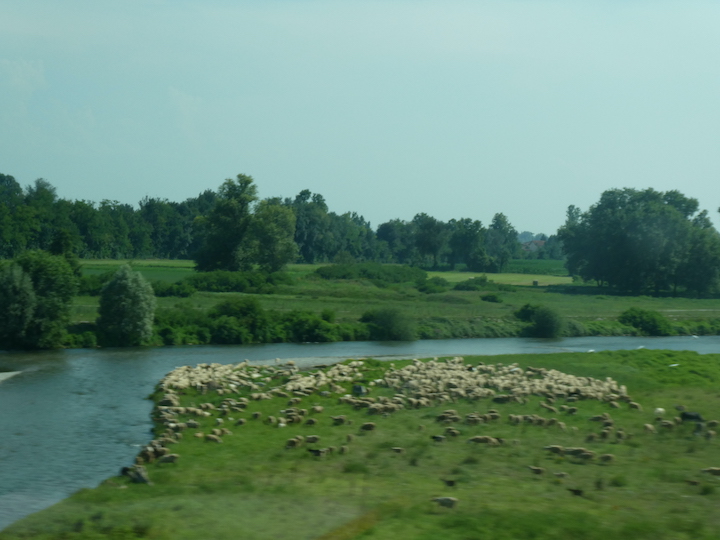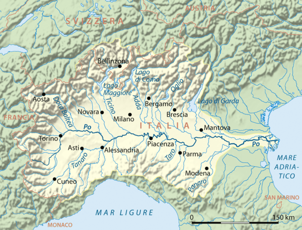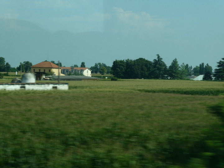 We’re crossing the broad plain of the Po River, the longest river in Italy. It begins in the Alps just inside the French border and then wanders across northern Italy to enter the distant Adriatic Sea, just a little south of Venice. The Lunghin Pass high in Switzerland is actually a ‘triple watershed’ for the Po, Rhine and Danube rivers, some of the most legendary rivers in the world. The Po then crosses the largest unbroken plain in southern Europe, a fertile countryside that produces some of the world’s finest foods. This valley is home to vineyards and broad fields of rice and grains; the area provides 40% of Italy’s milk production, and more than half of the pork. Think of Parma ham and that rich Parmigiana cheese we love to grate onto the finest pastas that they also produce here.