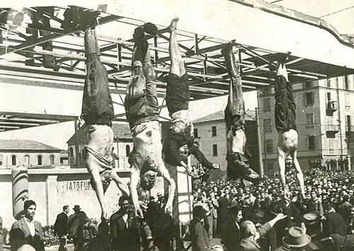 As an important industrial and transport center, Milan was heavily bombed by the Allies during WWII. By 1943, Mussolini’s dreams of a new pan-Mediterranean Roman Empire, by annexing Libya, Egypt, Ethiopia, Albania, and Greece, had crumbled. His gamble that the Germans would quickly triumph in the war was wishful thinking. In April of 1945 he was captured and executed near Lake Como while trying to escape in a German army convoy to the Swiss border. And Milan is where antifascist Italian partisans hung his body, along with that of his lover Clara Petacci and several other accomplices, in the Piazzale Loreto, which had been renamed Piazza Quindici Martiri after the 15 partisans executed there by fascist forces.