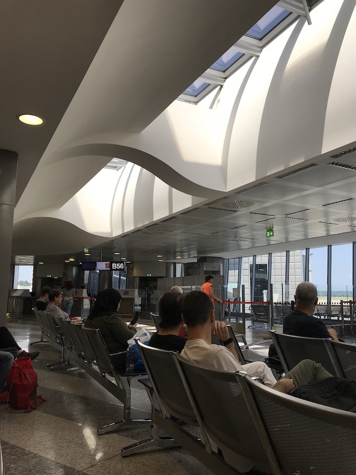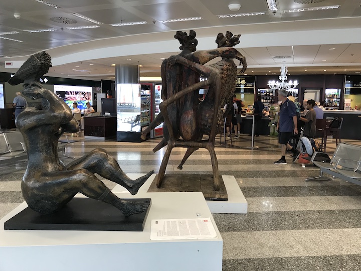 In the morning we catch a cab that’s driven by a lean and interesting young woman who is a marathon runner, and she delivers us to the city’s large Malpensa Airport (MXP) – where we discover that Milan is not finished with us yet! This airport is sixth in Europe for the number of countries served with direct flights – the Departure board is impressive – and around 87 different passenger airlines fly through here. This modernista building is filled with light and sculpture, fine music, and more high-end shopping. And then some kind of celebrity made a flashy ‘entrance’ where we were sitting, with a pro-looking film crew to record it all. We were very impressed, although we have no idea who she was!