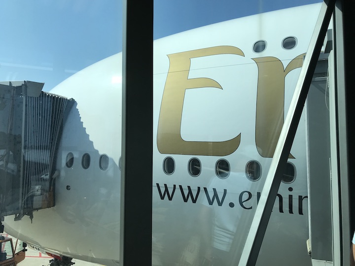 Carolyn managed to get us a good price on an Emirates flight, and it was one of the nicest flights we’ve had so far. We settled into plush seats with ample leg room, as we lifted from the runway and passed high over the multitude of red-tile roofs below. By dinnertime we were somewhere over the broad Atlantic, with an excellent meal and wine, before we slumped in our seats to relax into the night.