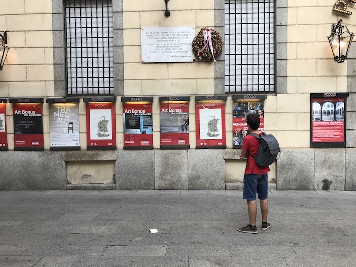The tragic history of Europe is long, and sombre wall plaques in many European countries mark the locations of various atrocities committed over the ages. This plaque is located on an outside wall of the Piccolo Teatro, and it reads: