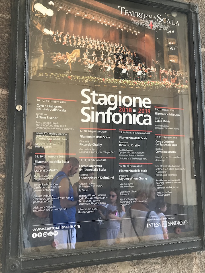 And there’s La Scala, the grand old opera house where many of the world’s great operas have premiered, including works by Salieri, Rossini, Donizetti, Verdi, and Puccini, among others. It’s late summer, and it appears we’ve missed out on this year’s events. But a poster for the upcoming winter-spring season tells us there will be much to offer in the next year.