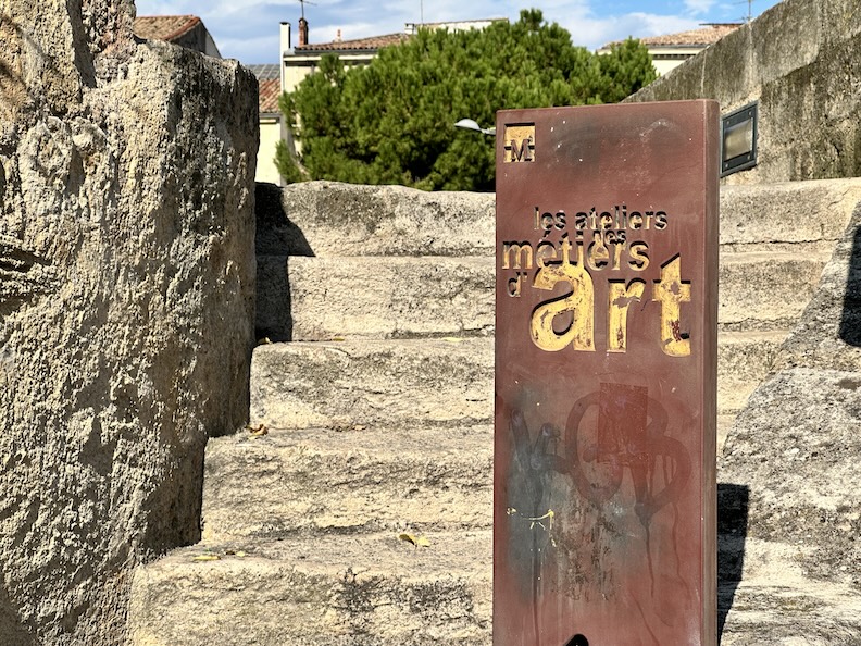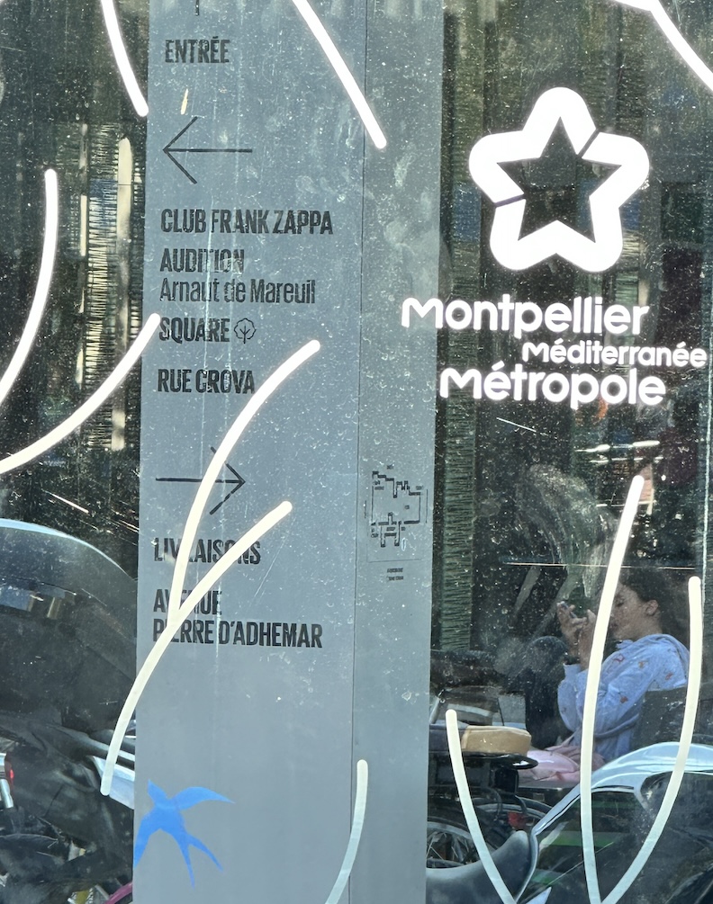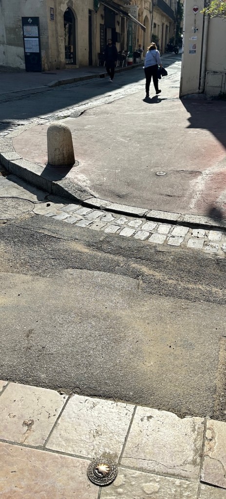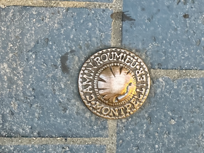 In our Euro travels we often find familiar markers that signify we’re on one of the many Vias, Caminos, Ways, Wegs, or Chemins that guide pilgrims across Europe to the famous shrine of Santiago de Compostela in Spain. Or in the other direction, to Rome. Or to boat embarkations for The Holy Land. These shiny brass markers in the pavement show the pathway through Montpellier along the Camin Roumieu, up the hill to the Place de la Comédie and down the other side, heading east through Arles and then onward to Rome. Or maybe we could go westerly from here across southern France to Spain. If you still have your hiking legs, there are lots of ‘ways’ to follow in Europe.