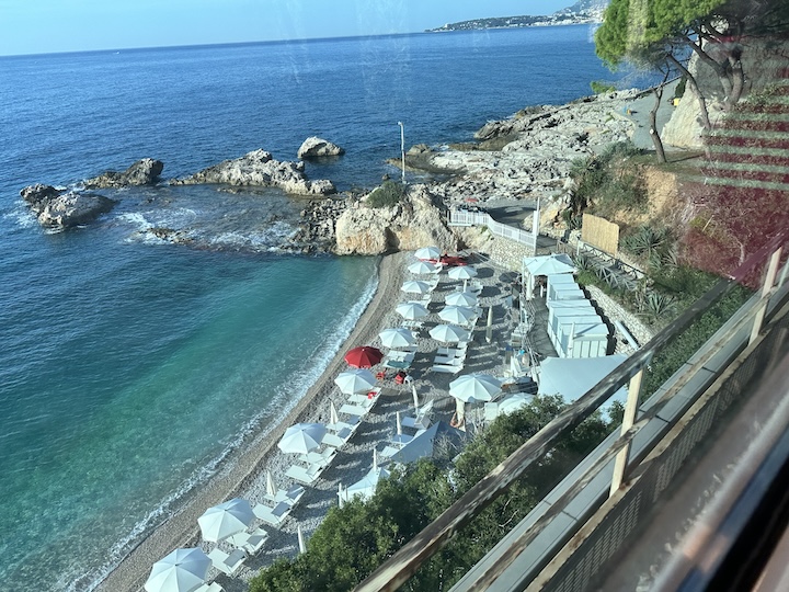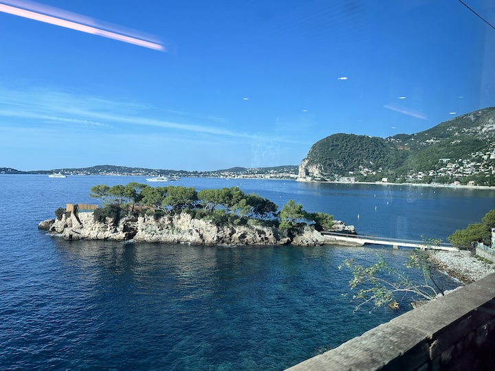 The rocky Ligurian coast of Northern Italy passes by our train windows, and soon we’ve crossed over the French border to make a change at the station in Nice.