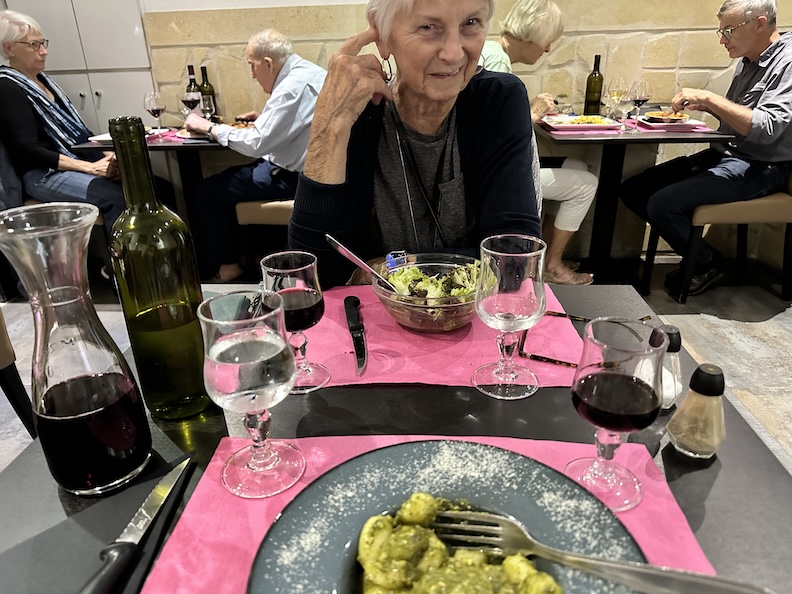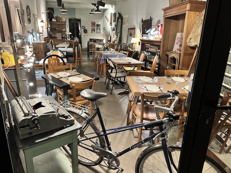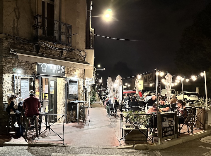 At the end of day, as nighttime finally blankets the town, the lights of a bistro named Atelier 29 beckon to us and we are like moths to the flame. And a delicious flame it is, with lots of grilled vegetables. For those who ask, “Ou est le bain?” (“Where’s the Bathroom?”), there’s a door at the back wall labeled “C’est ici” (“It’s here!”).