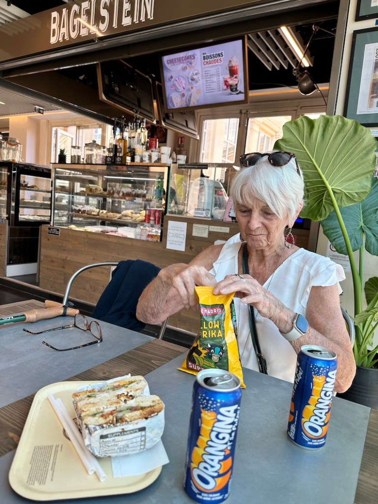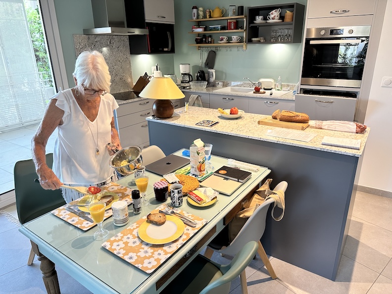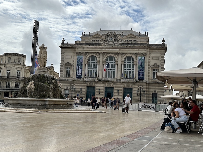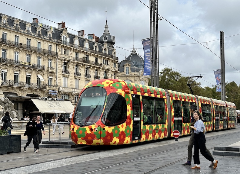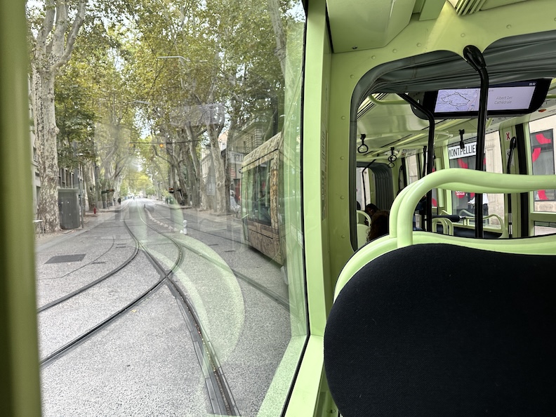 In the morning we enjoy a simple breakfast in our nice flat before we hop a tram for a cheap tour of the city. The tram takes us along tree-lined streets and across the Place de la Comédie, and we make a brief stop at the train station to get tickets to our next destination down the coast. And to enjoy some more of that good piano music we find in the train stations of Europe.