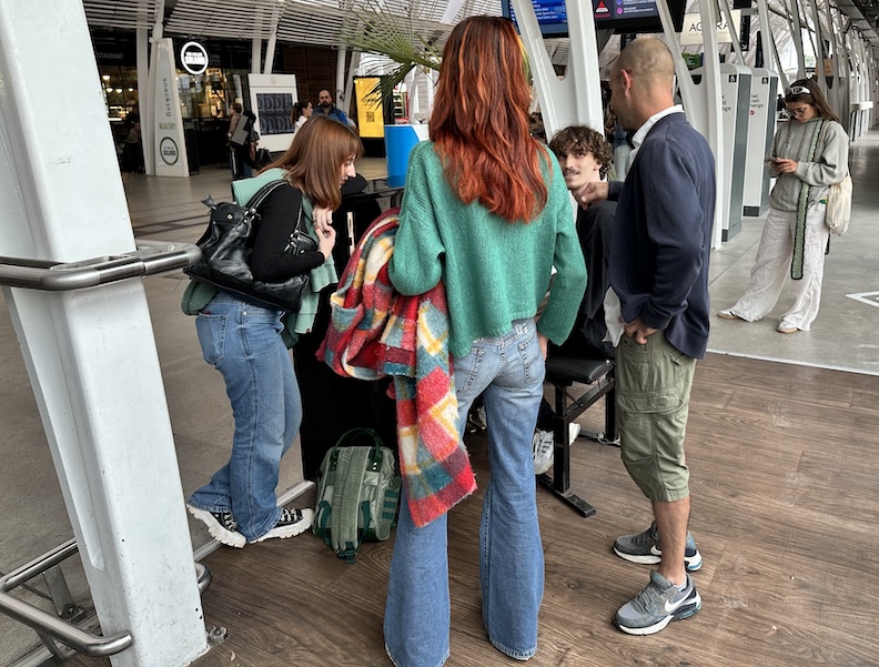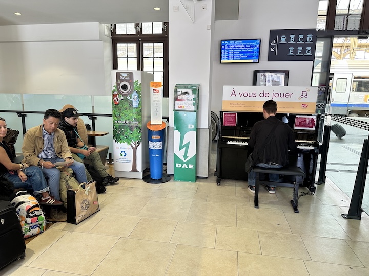 We can usually count on a talented person to take a seat at one of the public pianos that are thoughtfully provided in many Euro stations, And there is so much musical talent among the young people in Europe that they fill the place with fine music. The sign above the piano translates as, “It’s up to you.” (‘To bring this piano to life,’ I guess.)