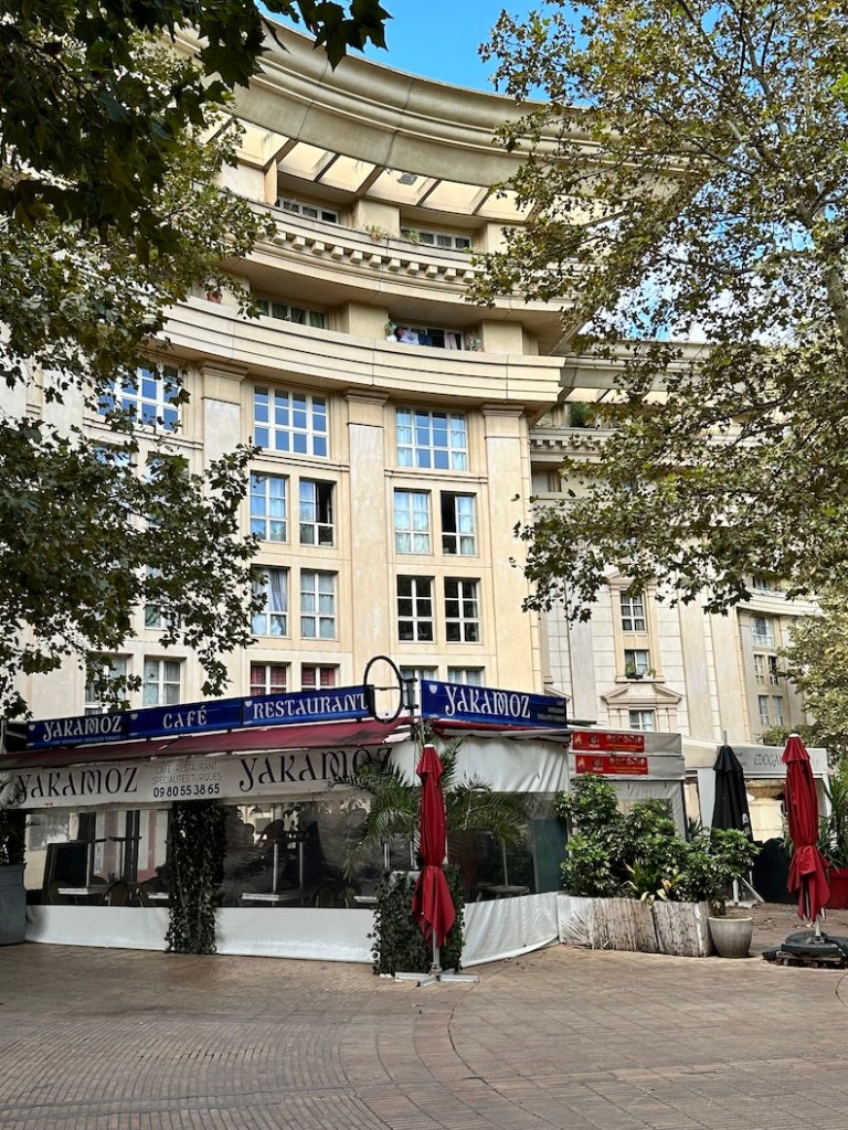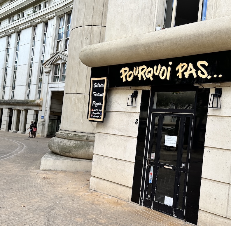 Just across the street is the ultra-classical Place du Nombre d’Or (Plaza of the Golden Mean), a mixed residential and commercial urban design project from 1999, by the noted Architect Ricardo Bofill, of Barcelona. He was an important modernist who was known for his ‘critical regionalism,’ an effort to correct the faceless and placeless lack of identity of the cold and sterile International Style. The broad entryway to the project leads to a quiet open walking space that’s sheltered from the noise of everything happening in the city. And there’s an eatery called “Pourquoi Pas” (“Why Not…”) that would certainly call to us if we hadn’t just had lunch.