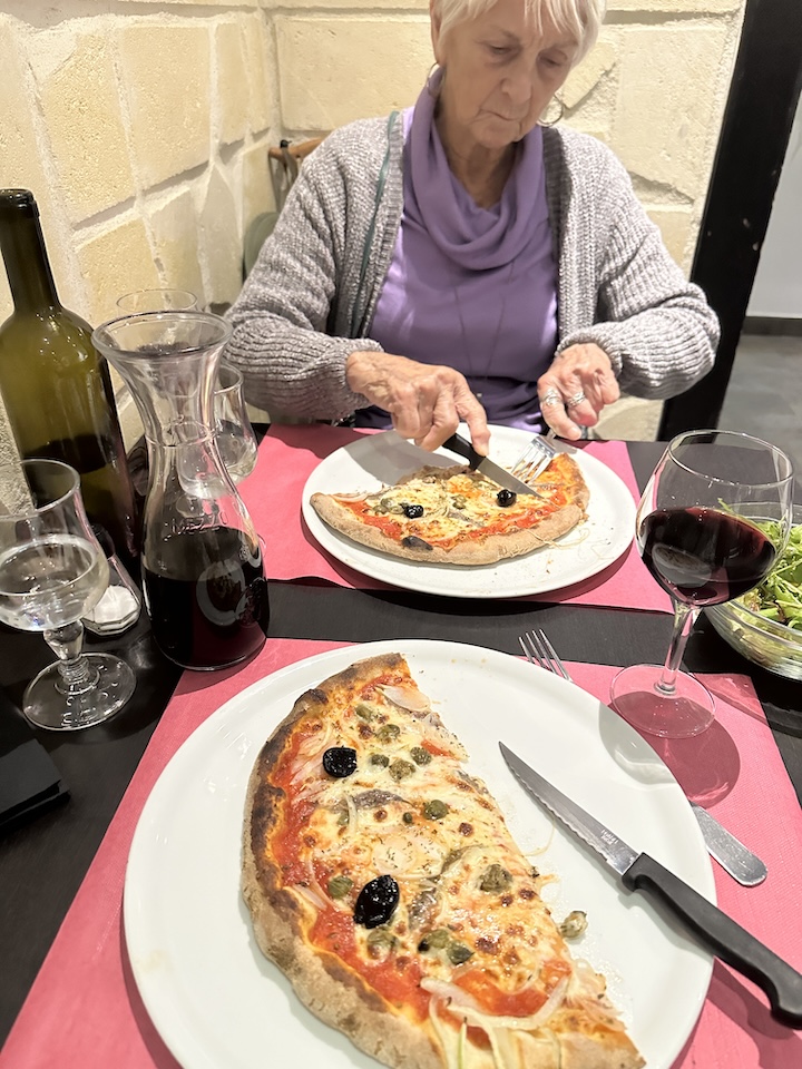 We arrive at Montpellier in the early evening to a very nice apartment in a quiet neighborhood. Soon we’ve found a friendly nearby eatery called Chez Vincent to share tables with the locals and enjoy an excellent pizza. There’s also an ample pichet of local wine to brighten the night.