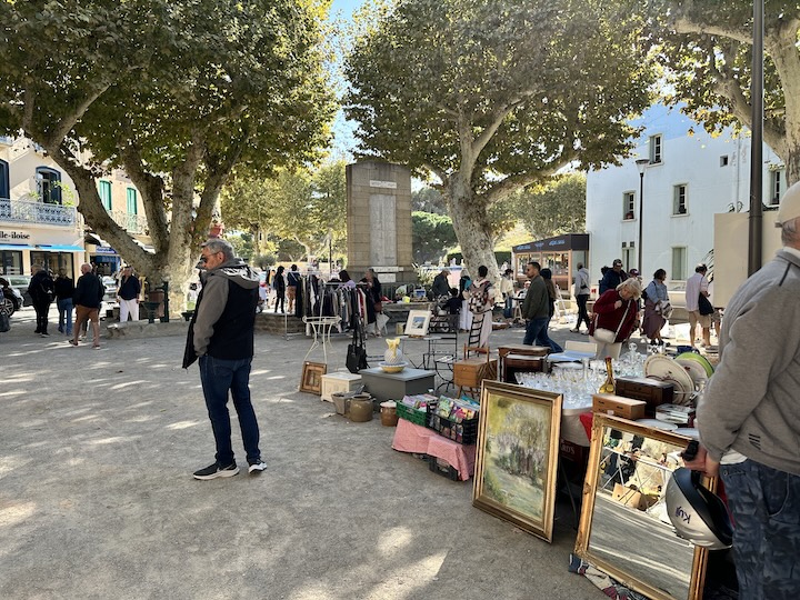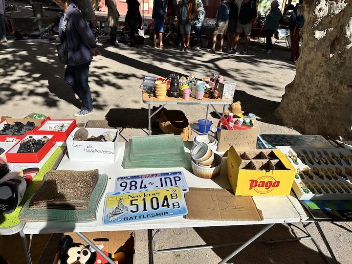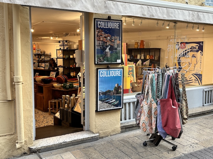 Another day finds us at Le Marché Traditionnel, the bi-weekly open-air market under tall spreading plane trees in the Place Gén. Leclerc. There were plenty of interesting things on view, if we weren’t still tossing our bags onto trains and concerned about the extra weight. But if we decided to relocate to gorgeous Collioure, there were temptations that could easily find a place on our walls and shelves.