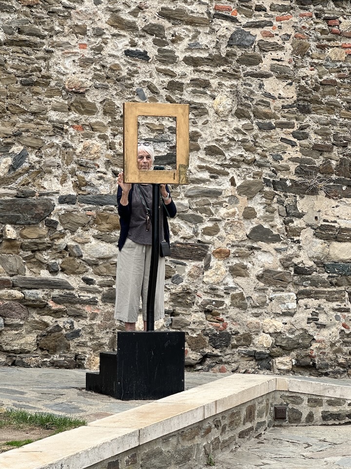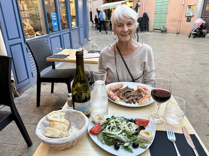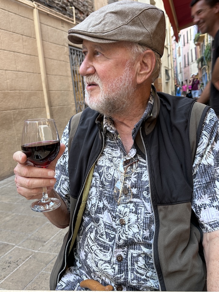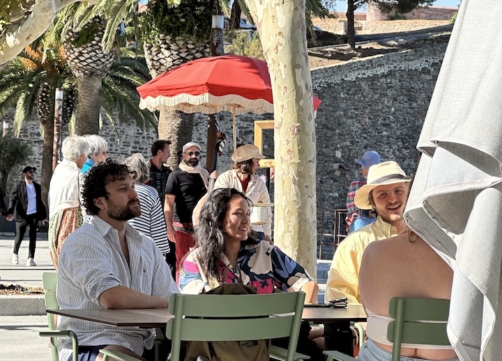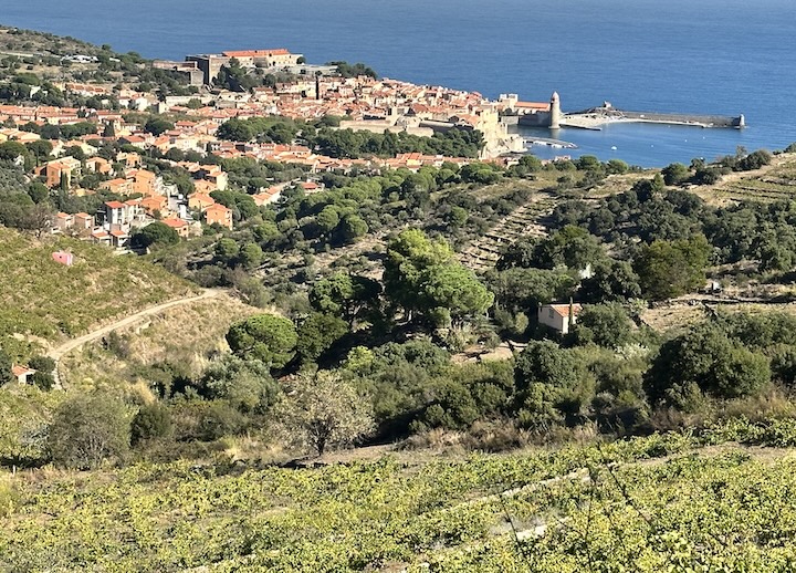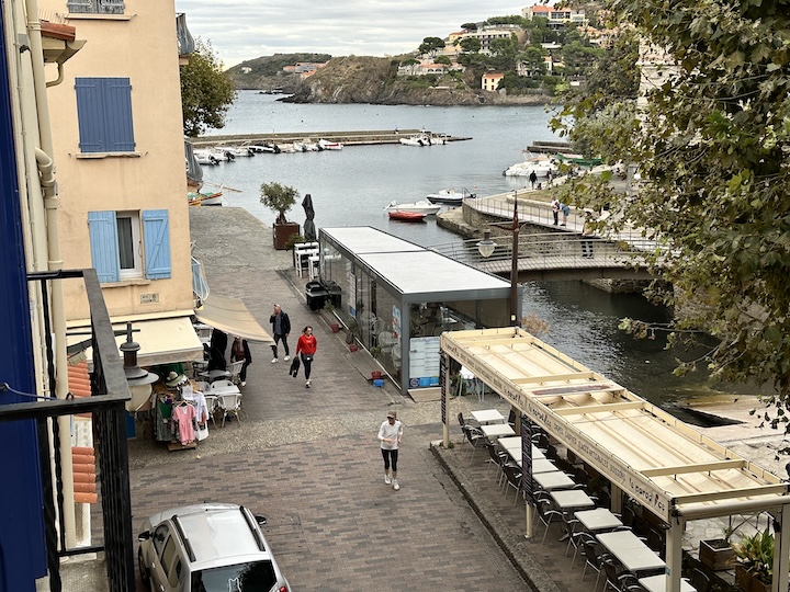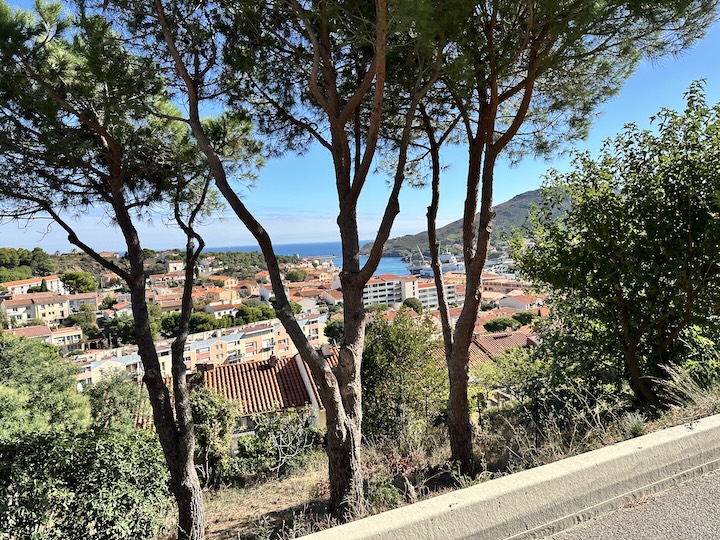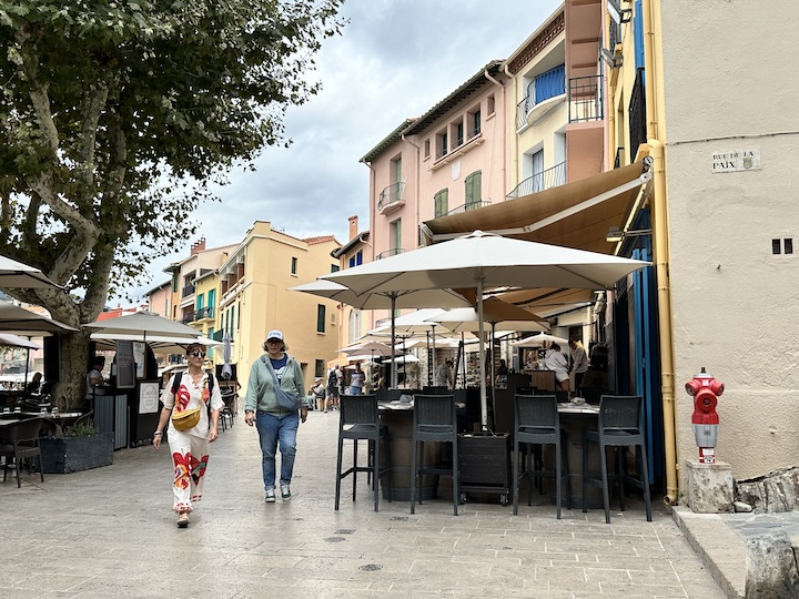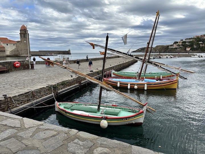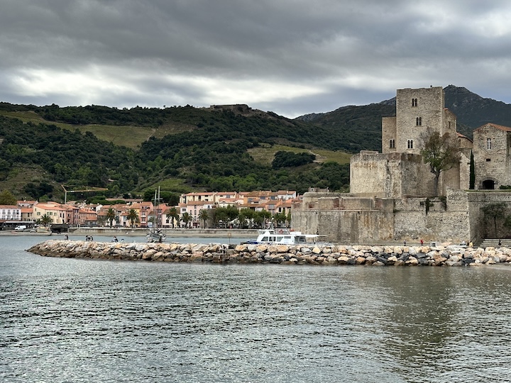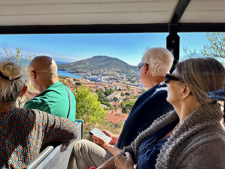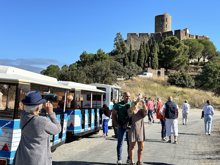 Morning again finds us in need of good coffee, with a good quiche. And an apple tart. And then we’re ready to board the local tourist ‘train’ that takes us to the hilltop castle on our scenic way to nearby Port Vendres. There are some far more ambitious folks than us who seem to have huffed their way to the top on bicycles. And there are others hiking the coastal trail. But those of us on the train seem to be happily sedentary.