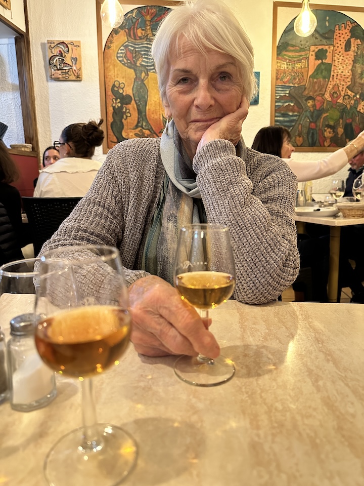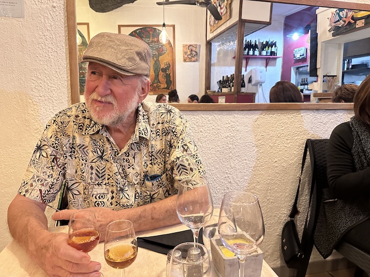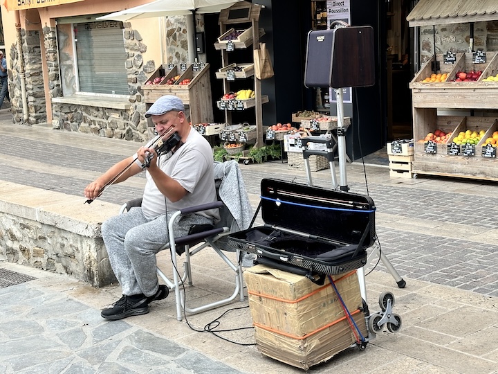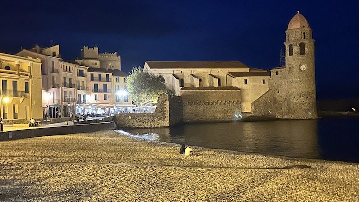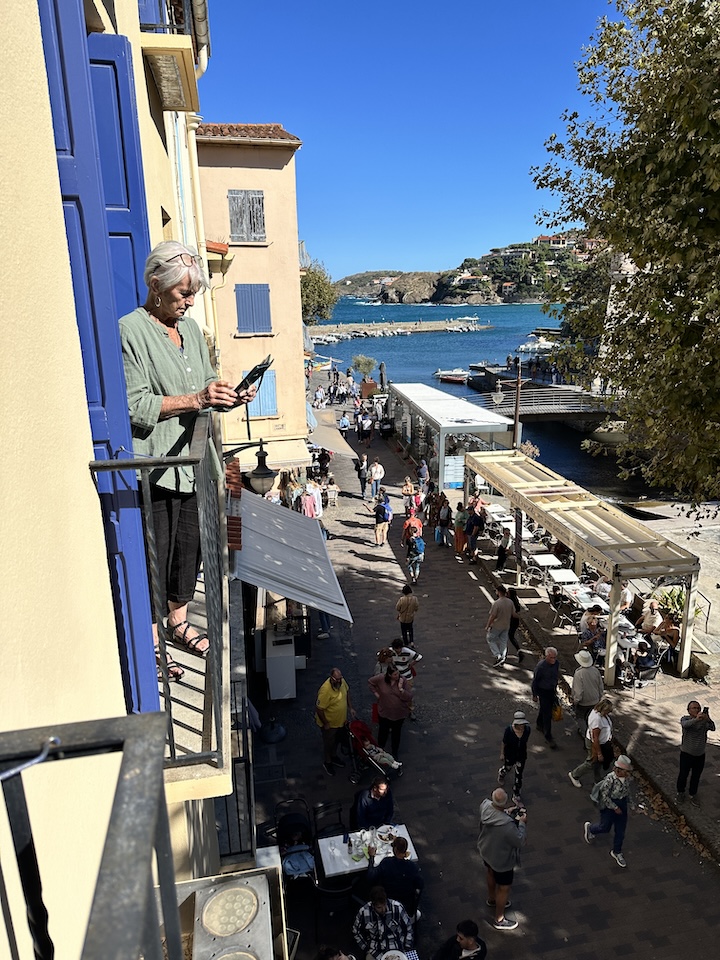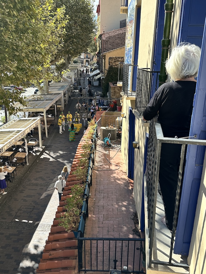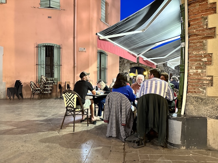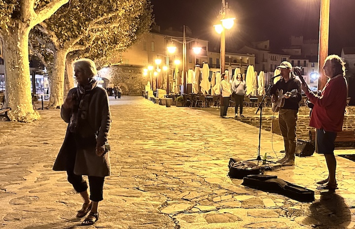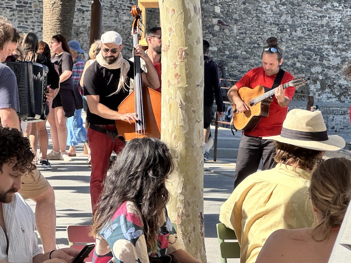 The train drops us off back in Collioure, where other musicians are awaiting. And more Euros are expected. We’ll be leaving in the morning so we make our way up through art-festooned hallways to our room for a last fond gaze from our balcony, and an afternoon nap. And later we emerge for a final good dinner in the narrow alleys of Collioure. It’s been a fine visit for us to this very sweet Mediterranean village.