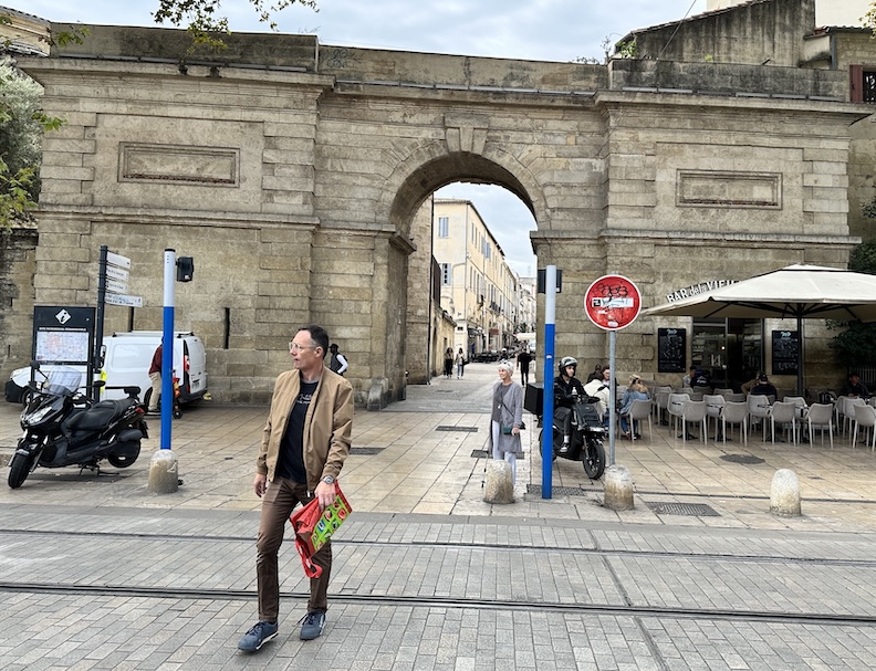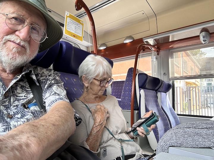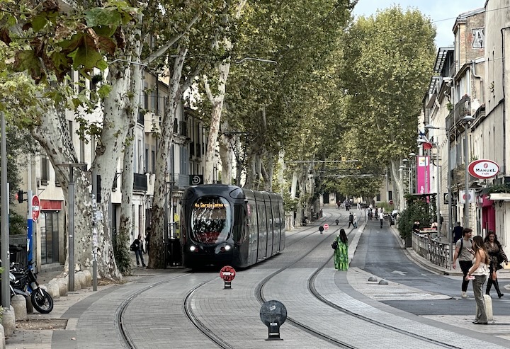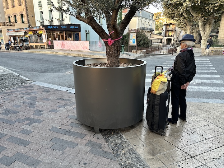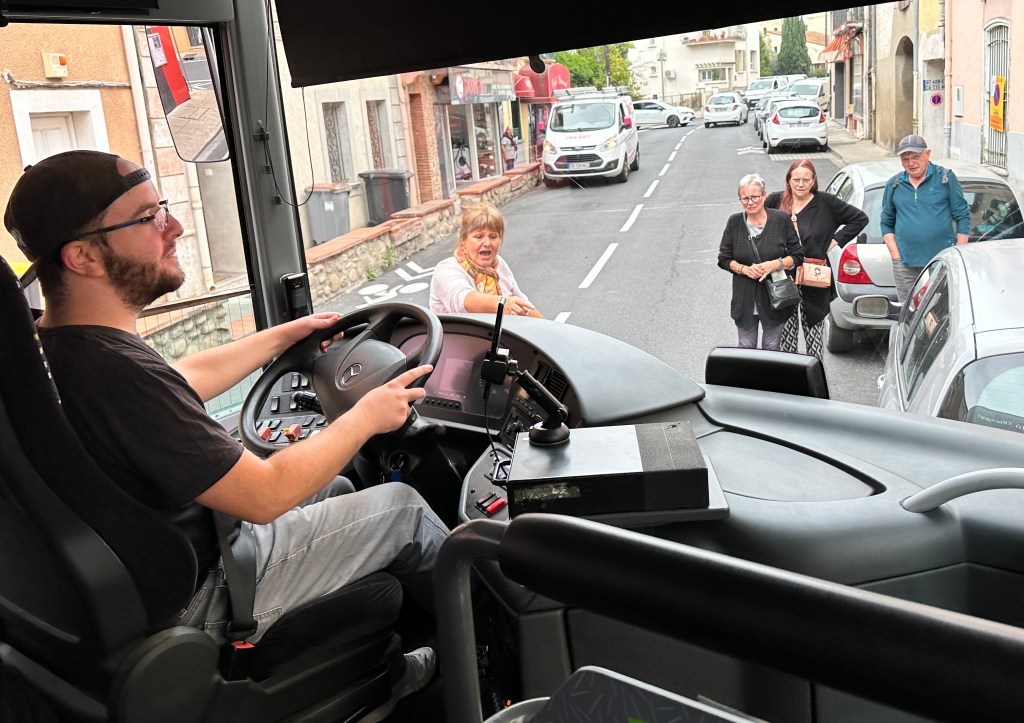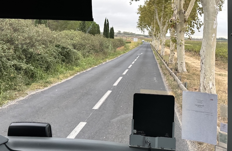 And then we wait for a ride, as local traffic passes us by. After a while a bus appears and the driver explains he’s there to pick up train passengers stranded at the stations and get them to Perpignan. If we’d just waited at the station he would have picked us up there. So we’ve gotten some very good morning exercise and now we’re getting a scenic view of rural France, as the driver takes us down tree-lined lanes and negotiates his way – with help from the locals – through the tight corners of several villages.