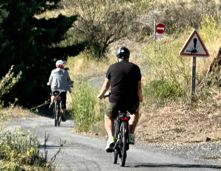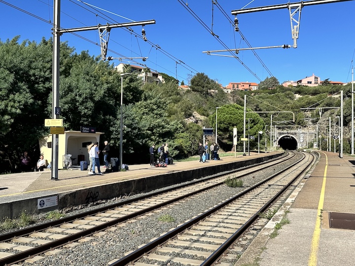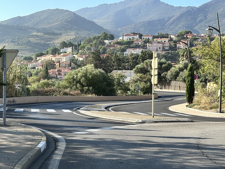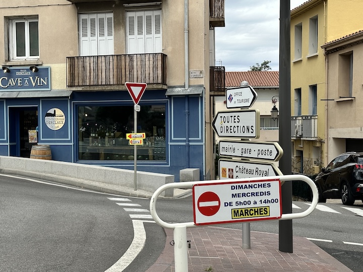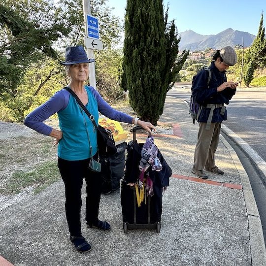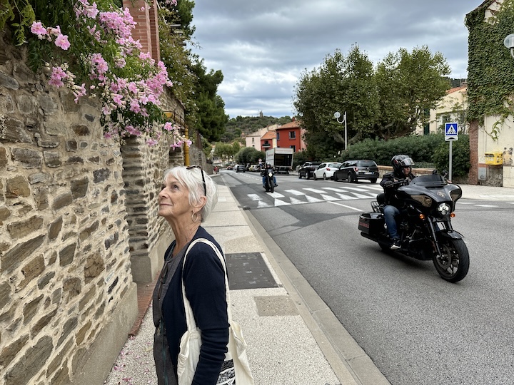 There’s only one thing to do. We follow him up a steep side street to the highway that runs over the hills in hopes of catching a local bus to the train station in Perpignan. We both like to think we’re still fairly young(ish), but after a glance at the two at us huffing our heavy bags, our new young friend grabs the handles of both bags and hauls them up to the highway for us. And we almost have to run to keep up with him.