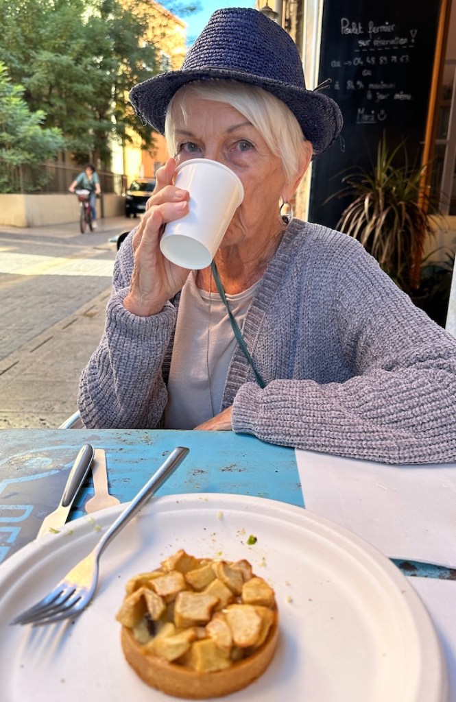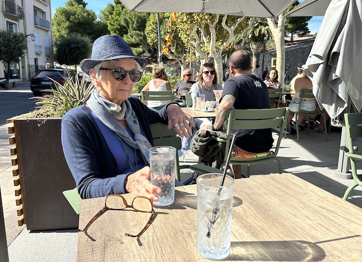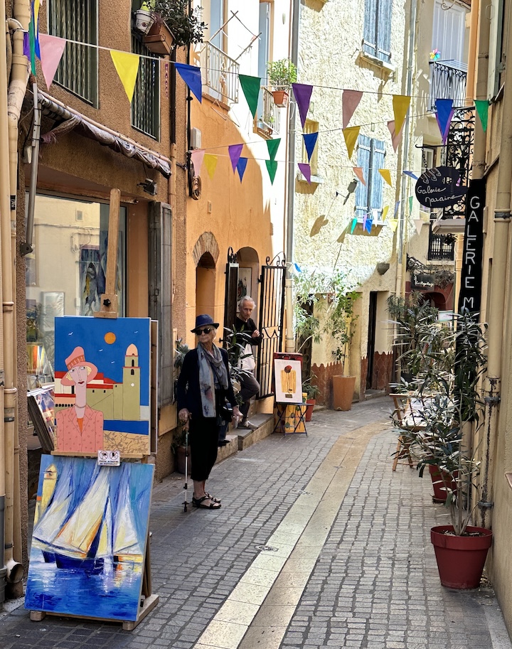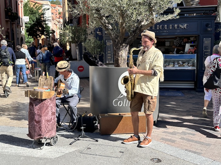 A good breakfast is easy to find among the quaint streets of Collioure, and we settle into a tasty morning egg casserole. Meanwhile, a street band is playing some good jazz just down the block. The galleries are opening their doors, and Carolyn managed to find a cute blue hat to go with her dramatic silver locks. Silver and blue make a very good combo.